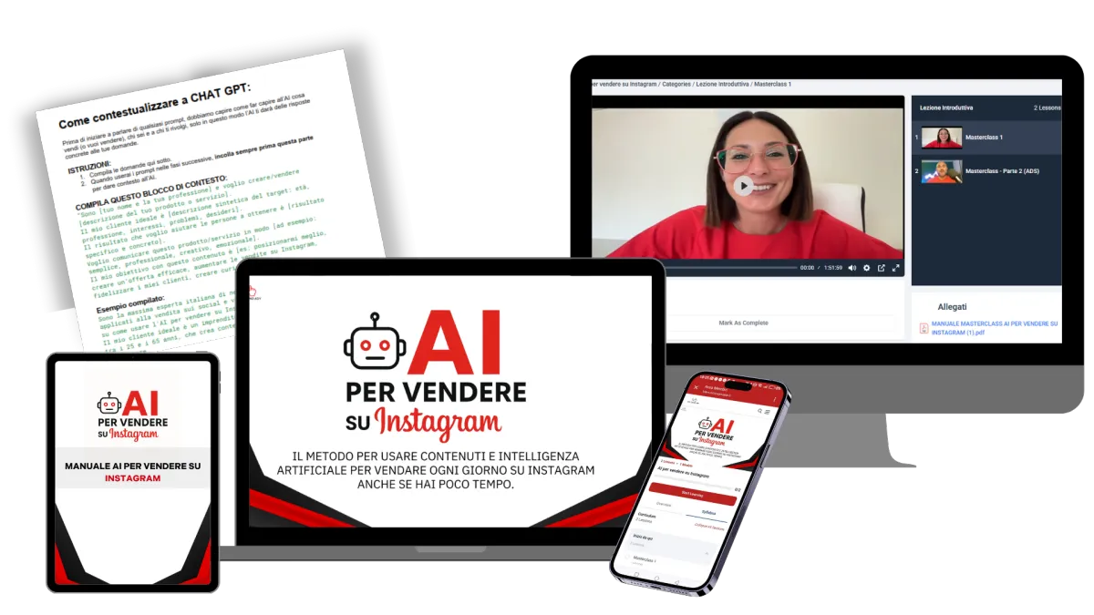 Con la Masterclass “AI per Vendere su Instagram” impari strategie semplici, esempi reali, prompt e script pronti all’uso per monetizzare davvero il tuo Instagram.