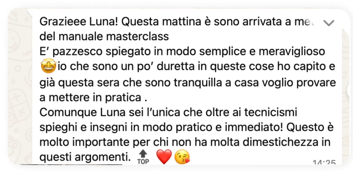 "Ho fatto tanti altri corsi ma erano solo teoria e non hanno portato risultati. Questa masterclass invece è stata una svolta: ho semplificato i contenuti e imparato a gestire meglio le ads"